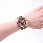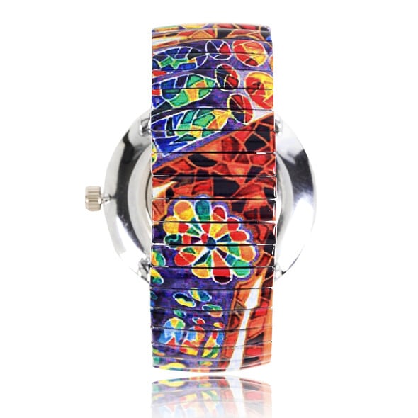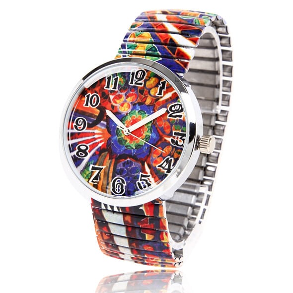 ステンドガラスからの光がイリュージョン的なアートなグラフィック柄です。力強い色使いと柔らかい曲線が魅力のデザインです。カジュアルな大きめフェイス&見やすい大きい数字の文字盤もおすすめです!またゴムの様に伸びるジャバラバンドは、着脱がラクラク♪おしゃれで使いやすい腕時計が、1万円台なのでプレゼントにも◎レディースとしてもメンズとしてもお使いいただけます。