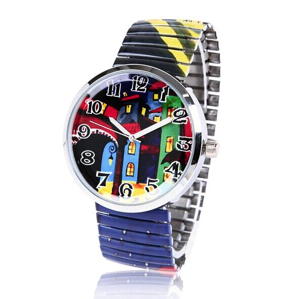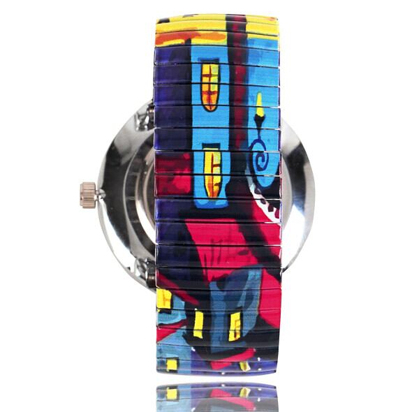 スペイン絵画を思わせる、まさにアート的なグラフィック柄です。絵の中に、2匹の猫のシルエットが。どんな猫なのか、何をしているのか、想像が膨らんでしまうデザインです。カジュアルな大きめフェイス&見やすい大きい数字の文字盤もおすすめです!またゴムの様に伸びるジャバラバンドは、着脱がラクラク♪おしゃれで使いやすい腕時計が、1万円台なのでプレゼントにも◎レディースとしてもメンズとしてもお使いいただけるデザインです。