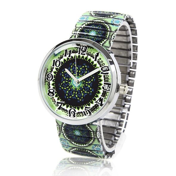 グリーンのグラデーションカラーがエレガントなグラフィック柄です。スカーフ柄にも使われそうな女性らしいデザインです。きれいめはもちろん、カジュアルなスタイリングにもコーデしやすい腕時計です。大きめフェイス&見やすい大きい数字の文字盤もおすすめです!またゴムの様に伸びるジャバラバンドは、着脱がラクラク♪おしゃれで使いやすい腕時計が、1万円台なのでプレゼントにも◎