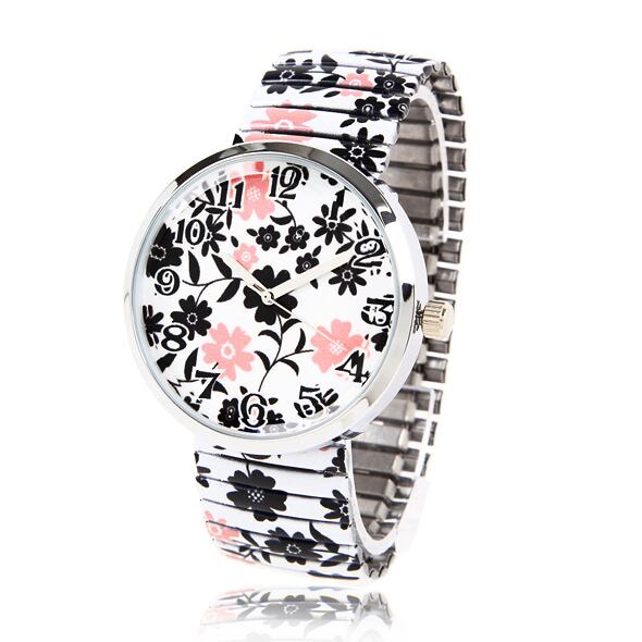 ブラックとピンクの小花柄が大人可愛いグラフィックです。少し辛めのシックなスタイリングやパンツスーツにも合わせやすい腕時計です。カジュアルな大きめフェイス&見やすい大きい数字の文字盤もおすすめです!またゴムの様に伸びるジャバラバンドは、着脱がラクラク♪おしゃれで使いやすい腕時計が、1万円台なのでプレゼントにも◎