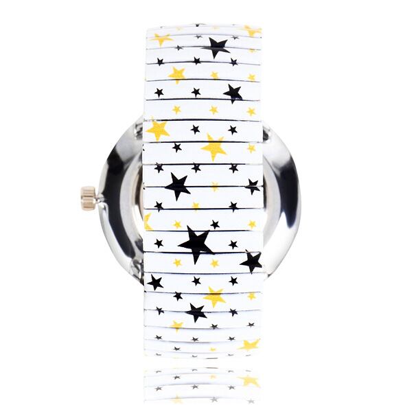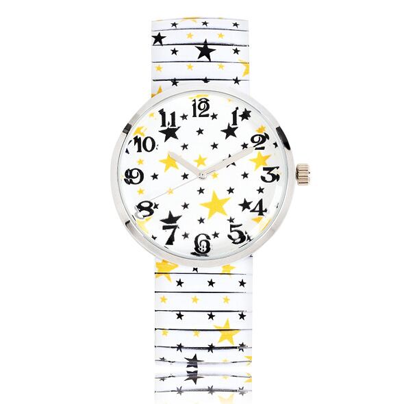 人気のトレンドモチーフ「スター★モチーフ」の柄。歴史あるスペインの建築物にも使われていました。現在(今)も過去(昔)も素敵なモノは変わらなく継承されています。カジュアルな大きめフェイス&見やすい大きい数字の文字盤もおすすめです!またゴムの様に伸びるジャバラバンドは、着脱がラクラク♪おしゃれで使いやすい腕時計が、1万円台なのでプレゼントにも◎レディースとしてもメンズとしてもお使いいただけるデザインです。